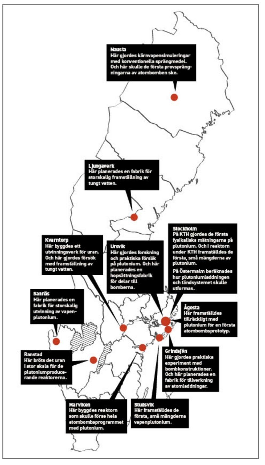 Under ett kvarts sekel pågick hemlig forskning på en svensk atombomb. Vid Försvarets forskningsanstalt började de trevande försöken kort efter att svampmolnen skingrats över Japan. Och de sista experimenten på vapenplutonium gjordes i februari 1972. Under tiden hade de svenska atombombsforskarna konstruerat allt som behövdes för att starta bombtillverkningen med ett par månaders varsel.